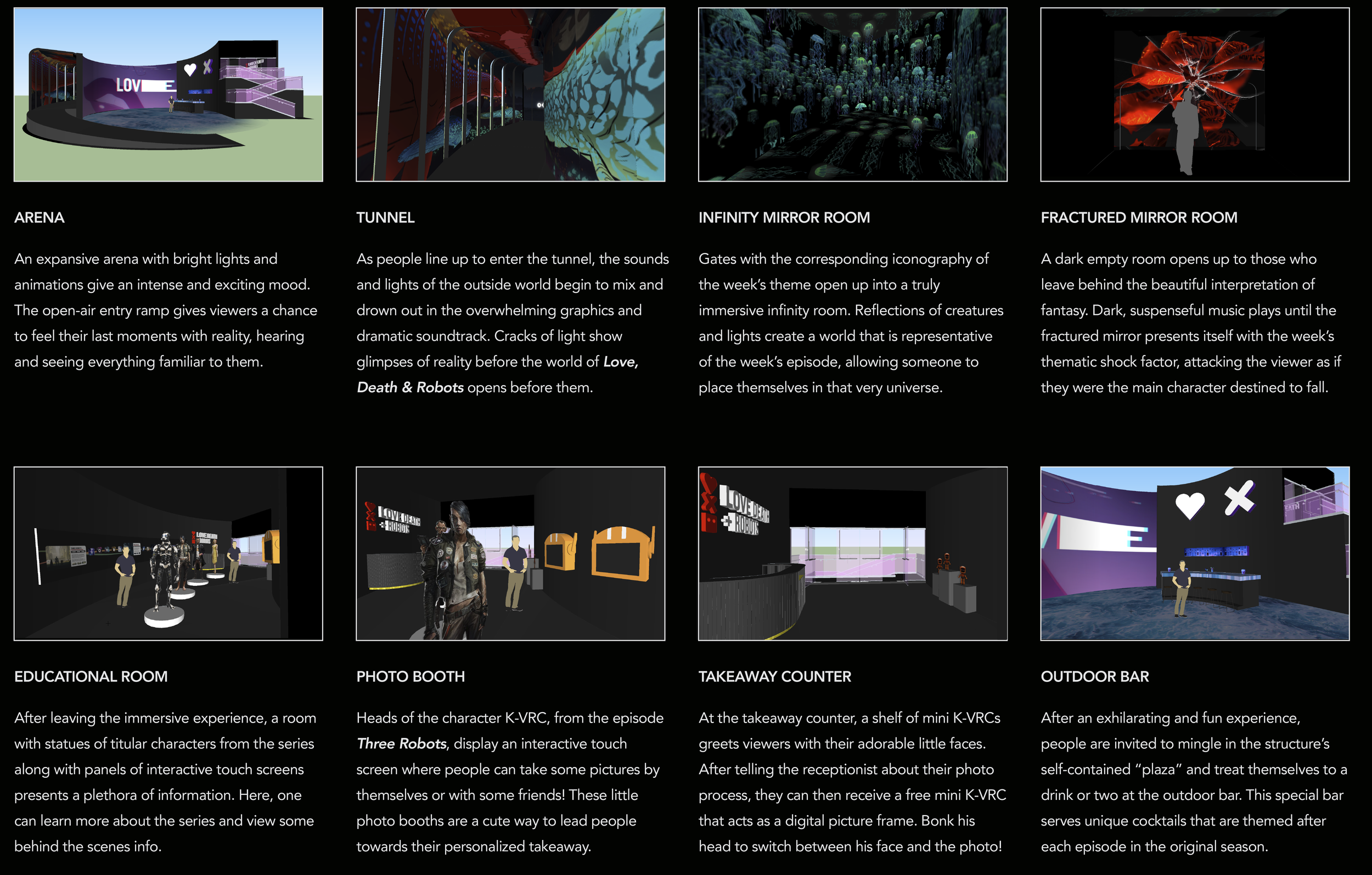 Love, Death & Robots is a collection of animated short stories that span science fiction, fantasy horror, and comedy. With a bold approach to each narrative, episodes are intended to be easy to watch but hard to forget. For this project, a promotional installation would be made for the series where audiences would be plunged into the world of animation derived from episodes of the series.