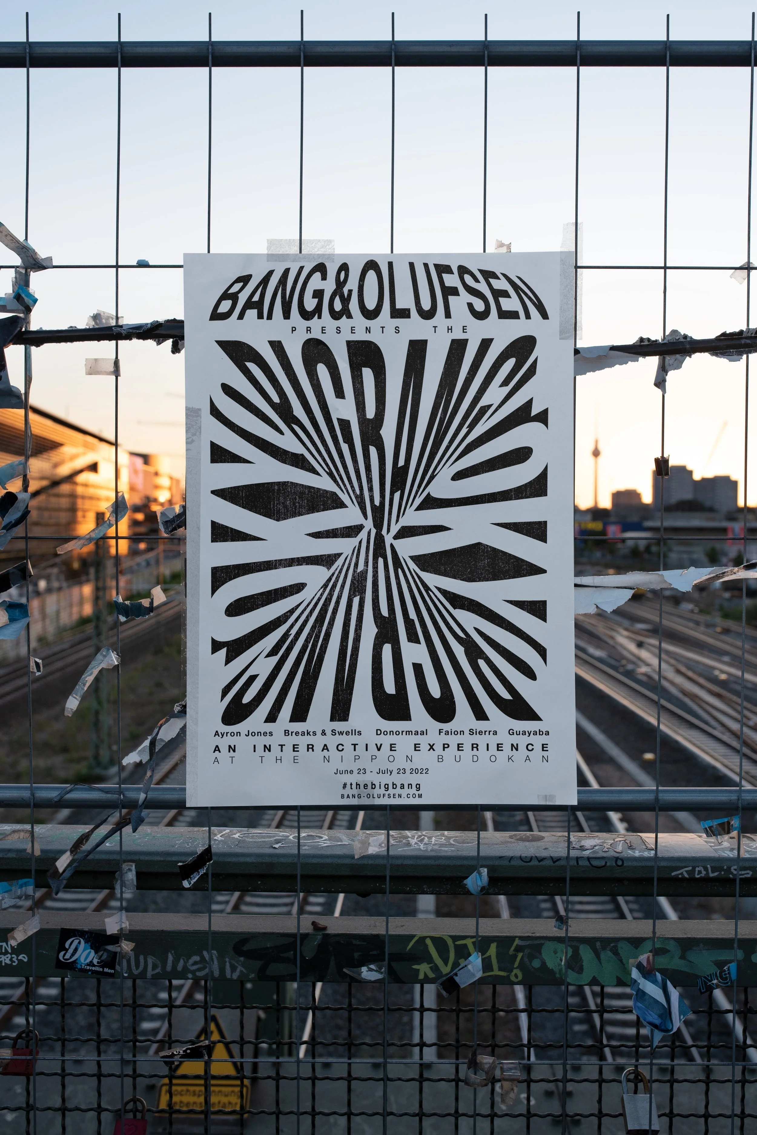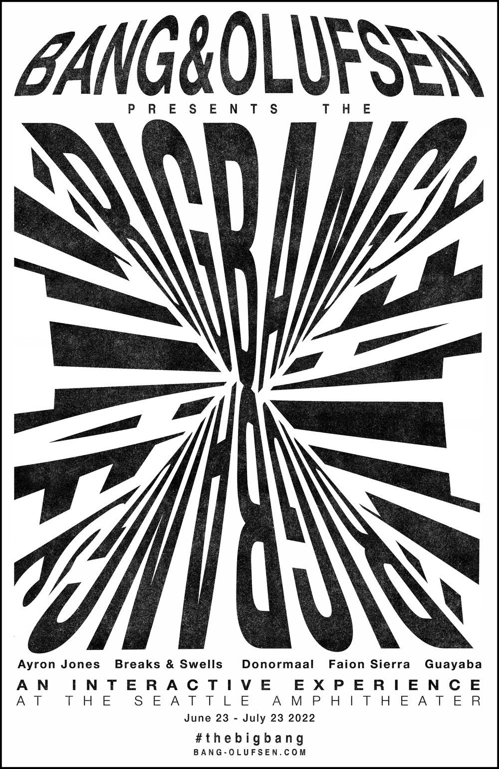High-contrast black and white posters for The Big Bang experience. These posters feature a type illusion design that corresponds to the concerts location.